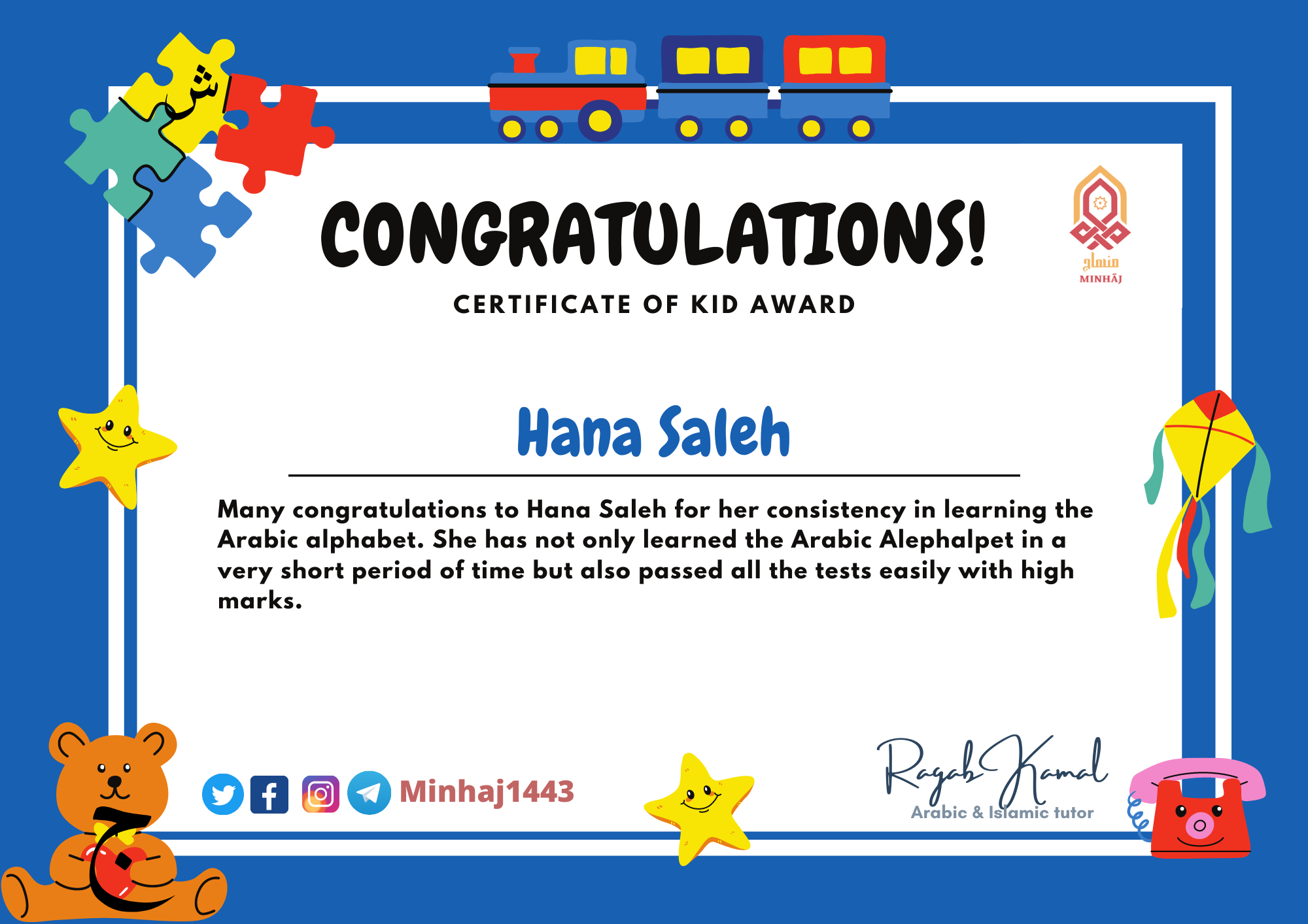 Many congratulations to Hana Saleh for her consistency in learning the Arabic alphabet. She has not only learned the Arabic Alephalpet in a very short period of time but also passed all the tests easily with high marks. In grateful for recognition for her enduring commitment to and efforts during the Arab & Islamic classes. She has been an example of a dedicated and good student. Thank you.